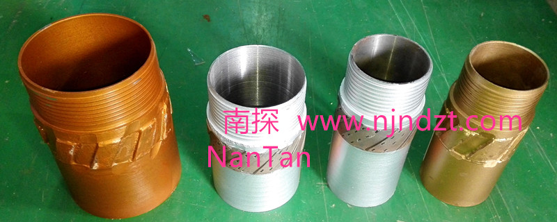 擴(kuò)孔器:連接在金剛石鉆頭與巖心管之間,起到擴(kuò)大孔徑和修整孔壁保證孔徑不縮小的一種鉆具。由于金剛石鉆頭直徑與巖心管外徑的尺寸相差很小,使孔壁與巖心管之間的間隙更加縮小,使過水受阻,并易造成卡鉆。金剛石擴(kuò)孔器是一短柱狀管體,上下鋼體部分有絲扣分別與鉆頭和巖心管相連,中間部分是覆蓋含金剛石的胎體,其外徑略大于金剛石鉆頭直徑(2毫米左右),胎體側(cè)表面上有過水水槽,使水流通過。在極堅(jiān)硬易磨性的巖層,也有使用兩個和多個擴(kuò)孔器,除一個裝在鉆頭的上部以外,其余的間隔地裝在巖心管之間。