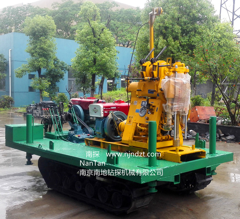 一、簡介 XY-1-L-01-A(B)型履帶鉆機及人字形四角架鉆塔,是將橡膠履帶底盤、動力(柴油機或電機)、鉆機、A型為4組手動支撐腿B型為4組液壓支撐腿、鉆機平臺、6米高人字形四角架起落鉆塔、水泵等共同組裝在一個機架上。鉆機、水泵一個動力(柴油機或電機),橡膠履帶底盤一個動力(柴油機或電機)帶動,互不干擾。該機型具有爬坡能力強、鉆進和行走穩(wěn)定可靠、載重質(zhì)量大等優(yōu)點,適用于地質(zhì)、冶金、煤炭、水文、建筑工程、水電工程、公路、鐵路、港口、城建、橋梁、壩基等建筑物的工程地質(zhì)勘察、淺層探礦、礦山坑道、水井、小型灌漿孔、爆破孔等的鉆進。該鉆機是適應新型市場需求不可多得的理想設(shè)備之一。可在海灘、河灘、沙地、水田等惡劣環(huán)境開展靜探作業(yè),結(jié)冰道路仍可行走。