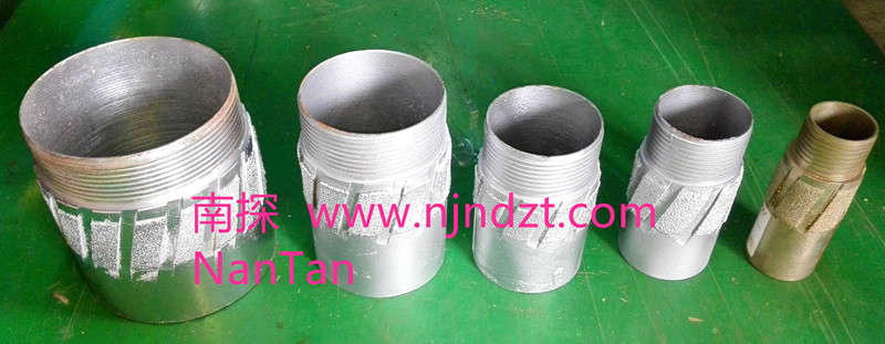擴孔器(電鍍金剛石):是連接在金剛石鉆頭與巖心管之間,起到擴大孔徑和修整孔壁保證孔徑不縮小的一種鉆具。由于金剛石鉆頭直徑與巖心管外徑的尺寸相差很小,使孔壁與巖心管之間的間隙更加縮小,使過水受阻,并易造成卡鉆。金剛石擴孔器是一短柱狀管體,上下鋼體部分有絲扣分別與鉆頭和巖心管相連,中間部分是覆蓋含金剛石的胎體,其外徑略大于金剛石鉆頭直徑(2毫米左右),胎體側(cè)表面上有過水水槽,使水流通過。在極堅硬易磨性的巖層,也有使用兩個和多個擴孔器,除一個裝在鉆頭的上部以外,其余的間隔地裝在巖心管之間。